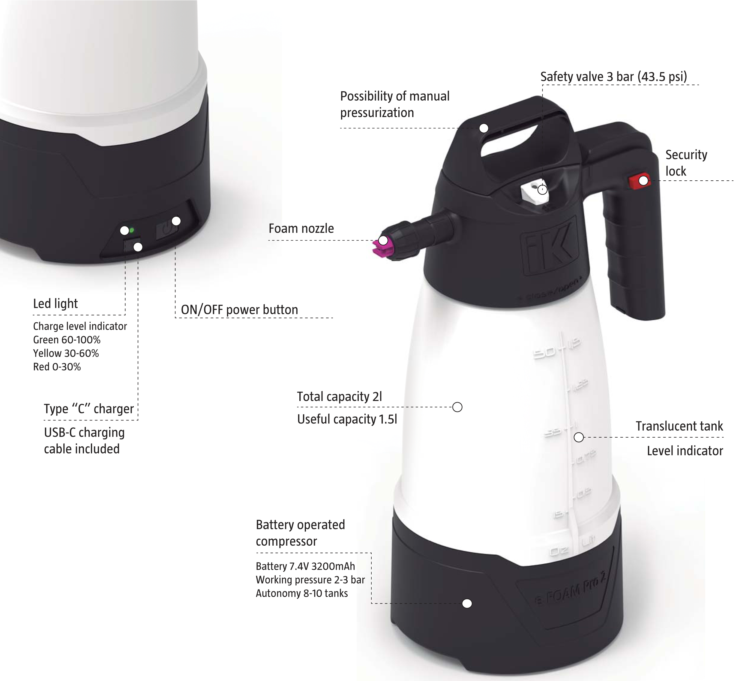 FEATURES: • Compatible with products from 0-10pH • Can be charged by pumping or air compressor • 3 types of foam, dry, medium, wet for different applications • Color caps to identify products • Markings on bottle to help with dilution • Safety release valve to prevent over pressure 43.5psi • Easy to maintain, no tools required to disassemble • 1.9L capacity • Safety lock on trigger